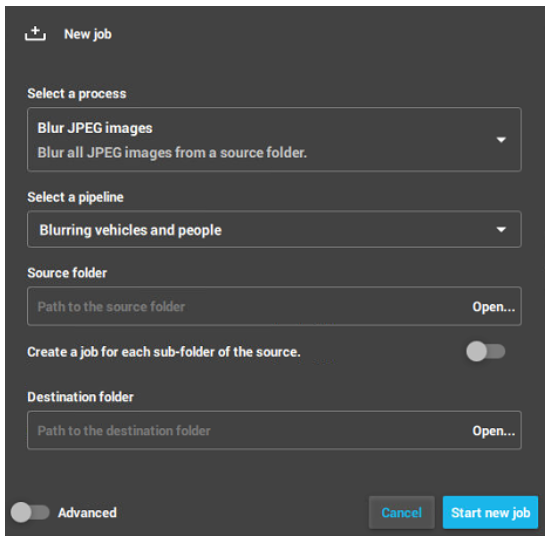 Press on the blue ‘start new job’ button to add the batch job to the queue.